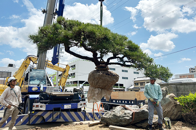 工事が決まった時のみ必要な木だけ仕入れて庭作りをするという造園業界のセオリーを覆し、ほとんどの現場において自社在庫の植物を使って庭を作ります。当社がこだわるのは、植えたあとの補償や将来性です。また、大径木もプランター管理していることで、難しいとされる夏場の工事や急な樹木供給、イベントへの貸し出しなどにも柔軟に対応しています。